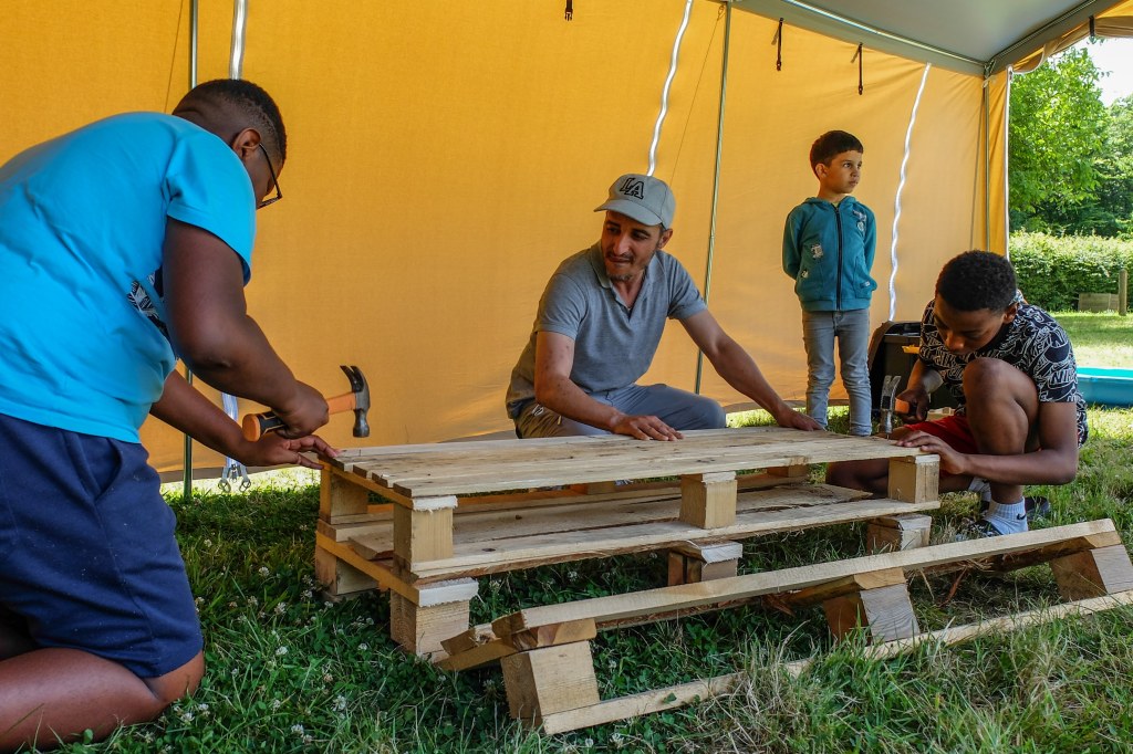 Le samedi 2 juillet après-midi a été consacré au bricolage animé par les animateurs de l’association Les camps sur la comète. Un groupe avec les plus jeunes enfants ont construit une cabane dans la forêt tandis que les adolescents ont confectionné des bancs avec des palettes afin de les mettre autour du feu. Un papa des ateliers OEPRE a partagé toutes ses connaissances et ses compétences du travail du bois avec les enfants et ados du camp!
