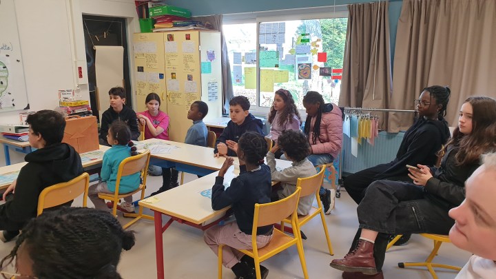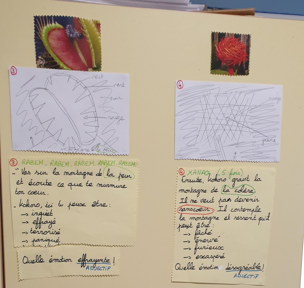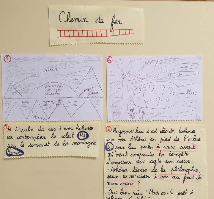 Ci-dessous, quelques photos de la rencontre et du « chemin de fer » préparatoire élaboré par les CP. Un récit court mais riche, mêlant mythologie, philosophie et les différentes cultures d’origine des élèves !