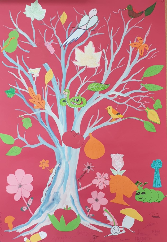 A cette occasion, les élèves ont dessiné un arbre chargé de fleurs, de fruits et d’animaux. Chaque élève a découpé l’animal qu’il avait dessiné puis l’a collé sur l’arbre. Ainsi, ils ont donné la vie et l’âme à cet arbre.